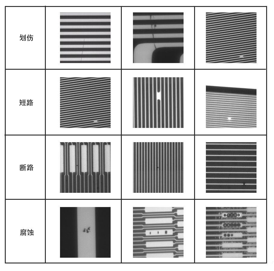 Line scratches, micro scratches, short circuits, open circuits, micro breaks, foreign objects (dirt), corrosion, burrs, etc